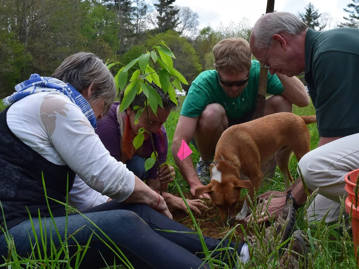 Located at the entrance to our campus on sunny, open land, the farm consists of multiple field plots with rich soil, a small propagation greenhouse, a hoophouse for season extension, a composting area, a young food forest, abundant native and perennial landscaping, and a historic stable building used for poultry and tool storage. We farm with respect for the interdependent web of life, using regenerative farming techniques and permaculture principles, such as limited tillage, cover cropping, integrated pest management, composting, and mulching. The farm aims to preserve the health of the soil, water, and diverse ecosystems on our site in the Southern Appalachian Mountains.